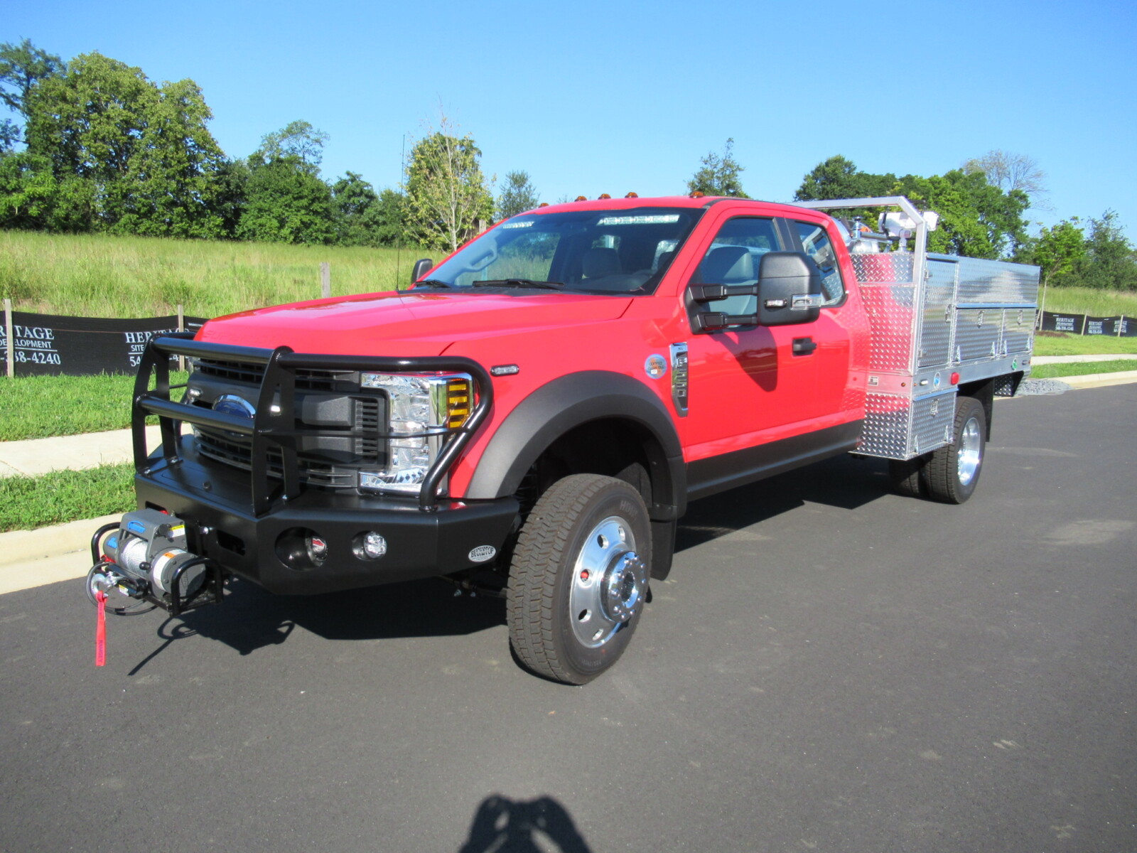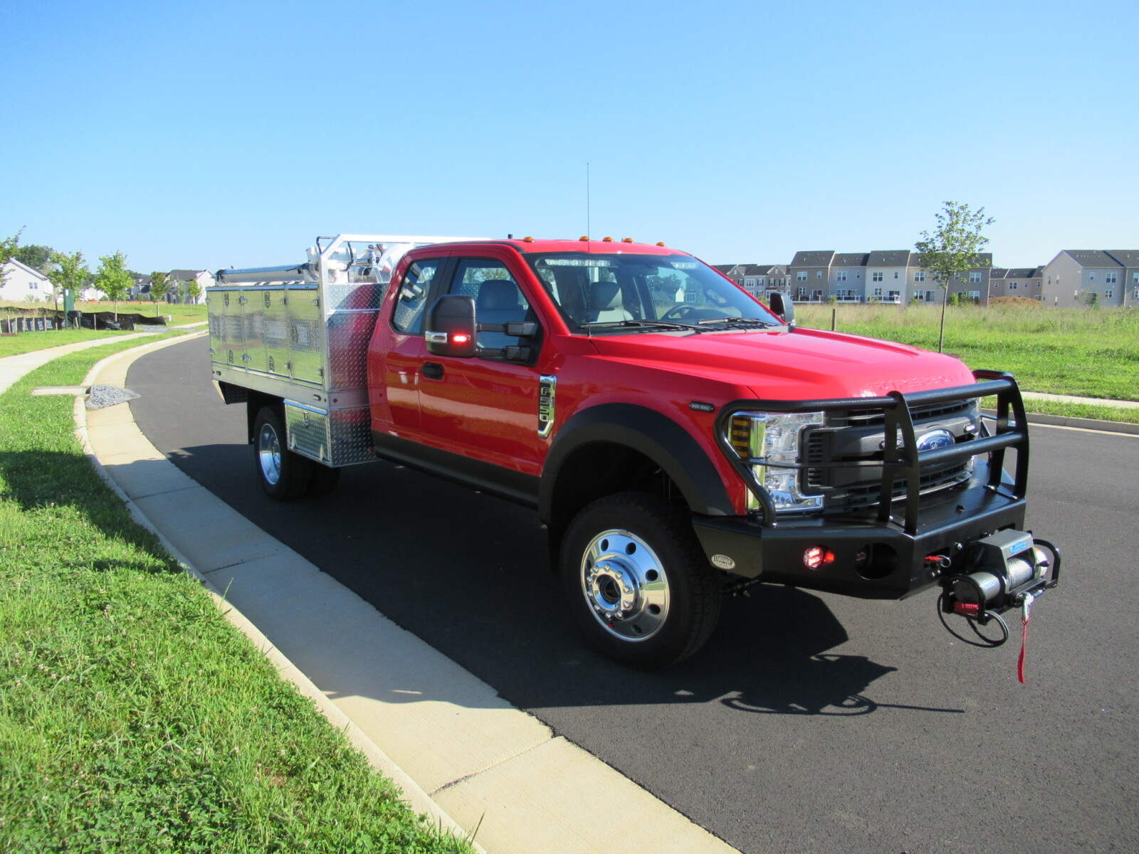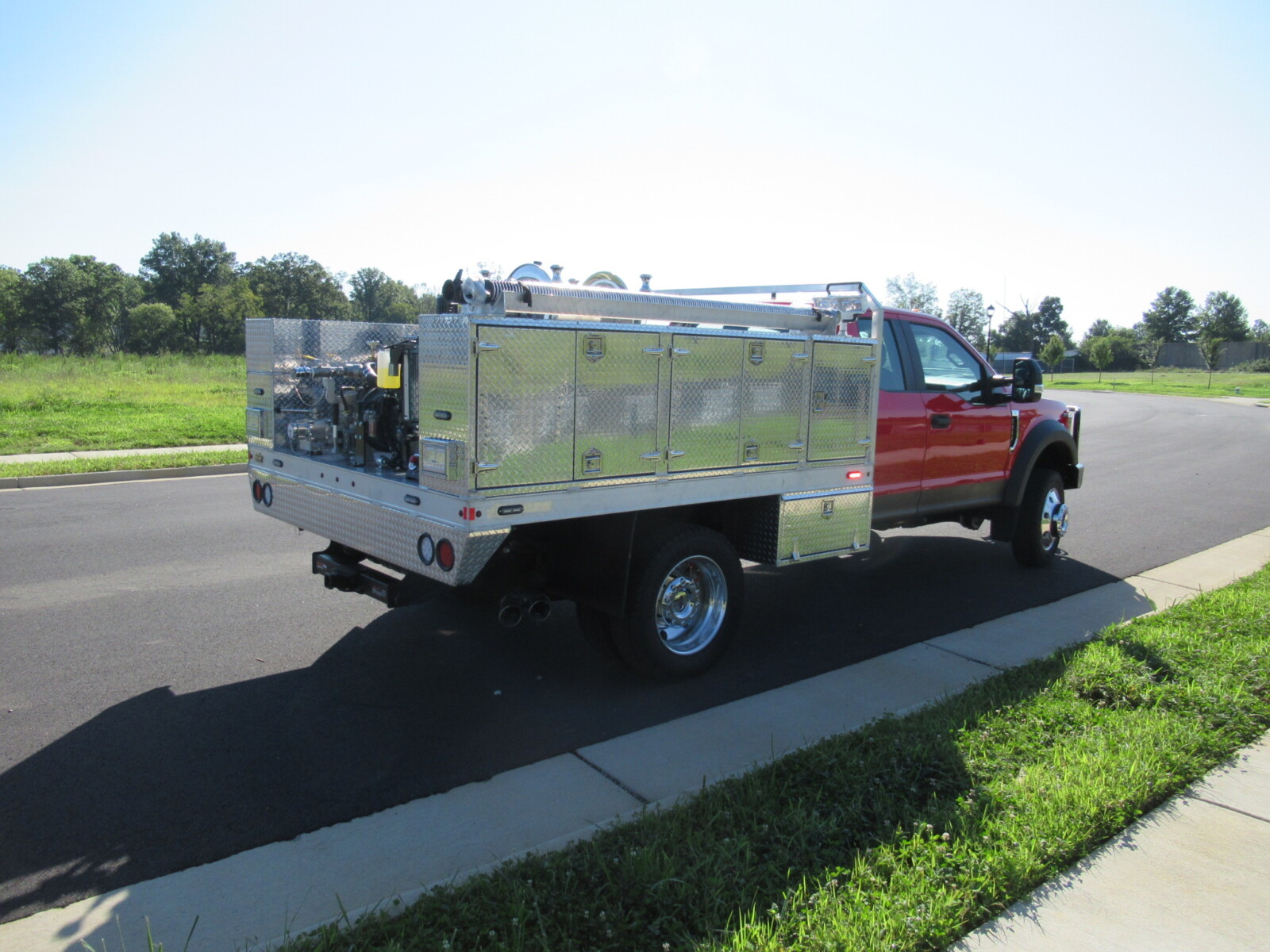 Whelen Lighting System, Custom Console, Map Storage, Custom Aluminum Bed Body, Custom Pump System w/ Kubota Portable Pump, HD Booster Reel, Buckstop Bumper, Ramsey Winch System, Western Contractor Grade Plow, Custom Welded Mount.