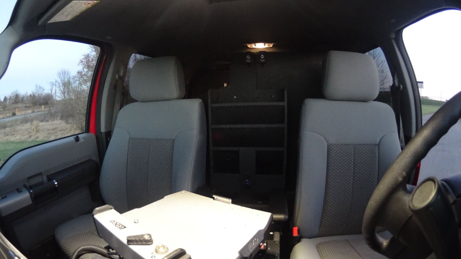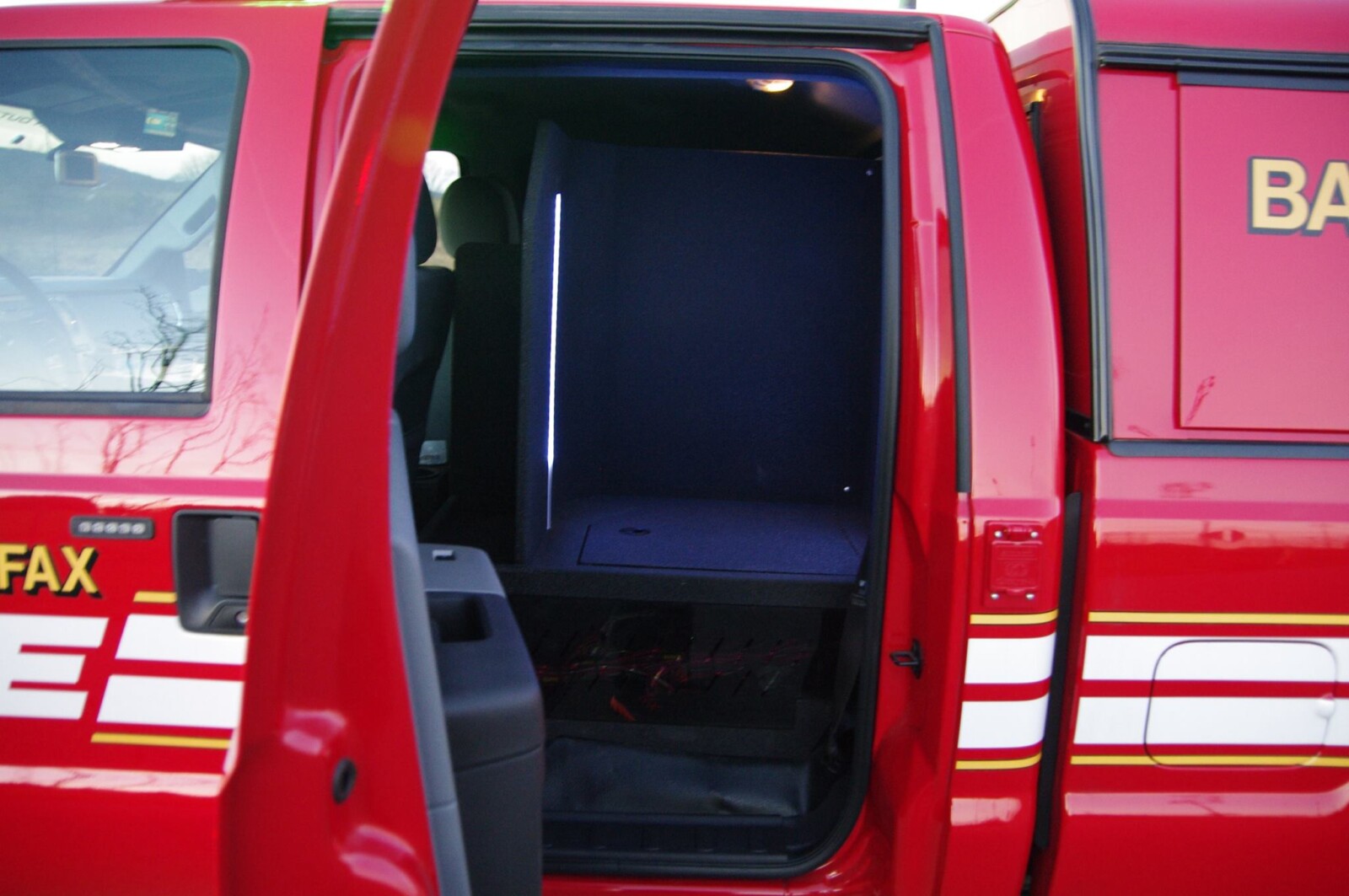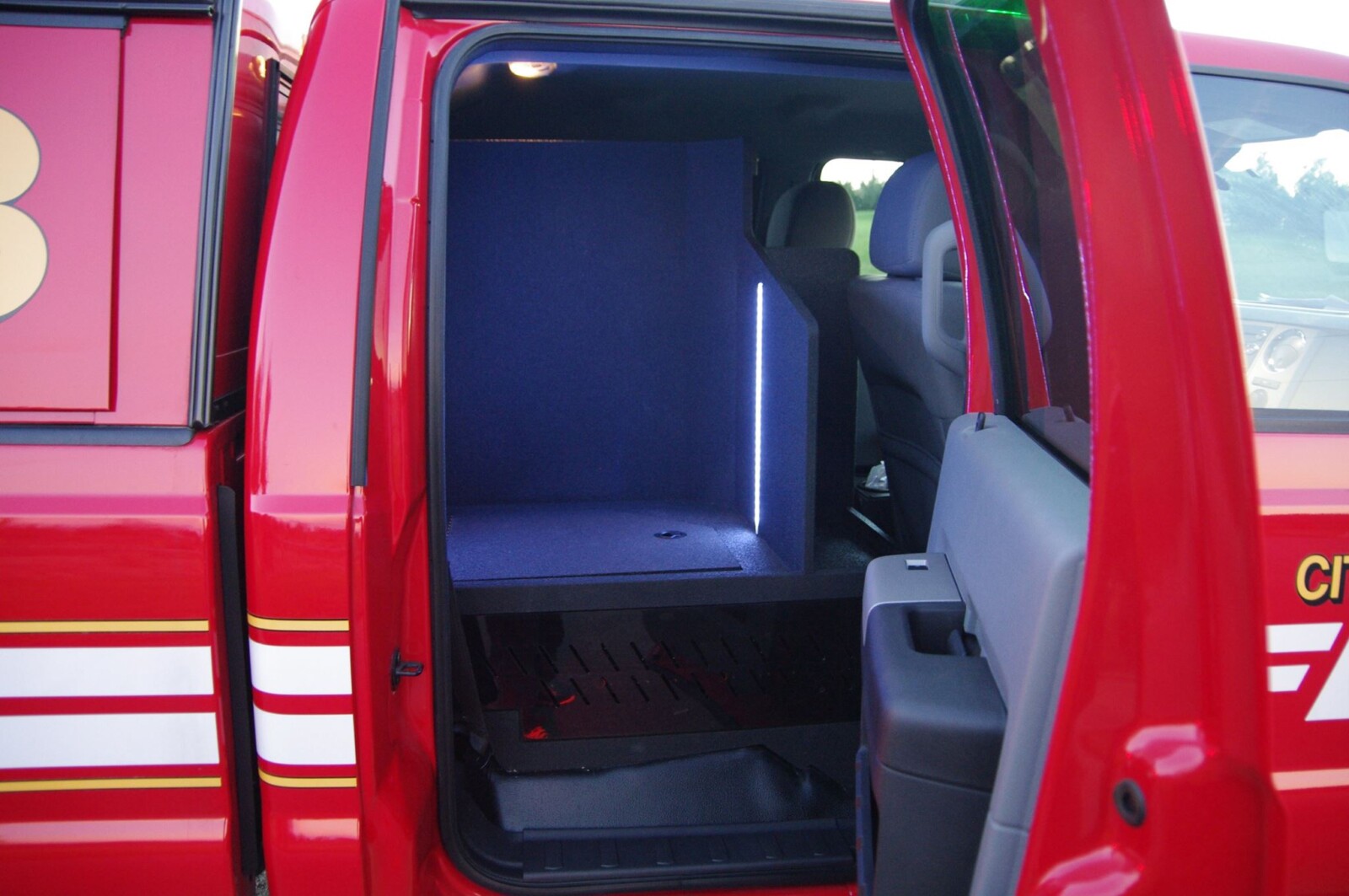 Pop command board, Side storage, Custom center console, MDC mount, Mobile radios, Midrow cabinet, FastPLEX technology for lighting and siren control.
