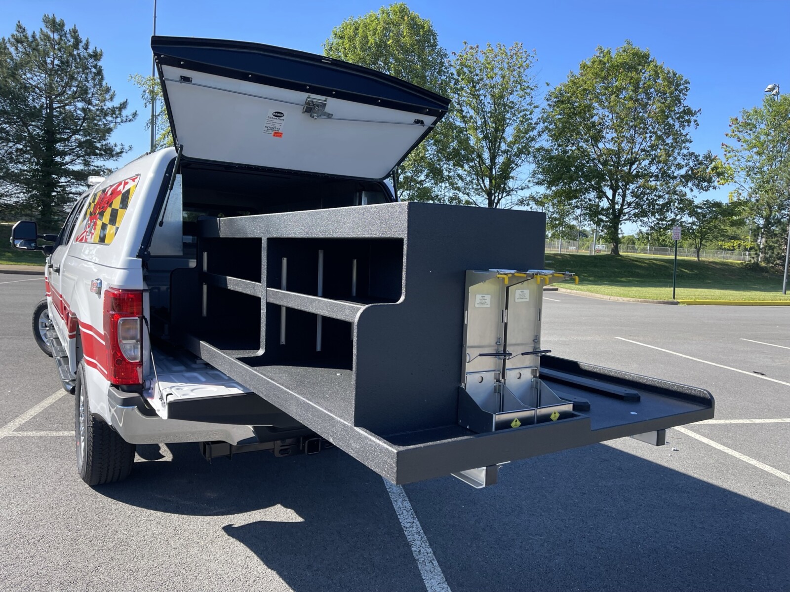 Full Whelen LED Lighting Package | Custom front Console  | Ranch Fiberglass Cap | 100% HD Slide Out Rear Storage Cabinet | Dual Zico Quick Release Oxygen Brackets | Backboard Patient Transport Area | Progressive Dynamics Pure Sine Inverter