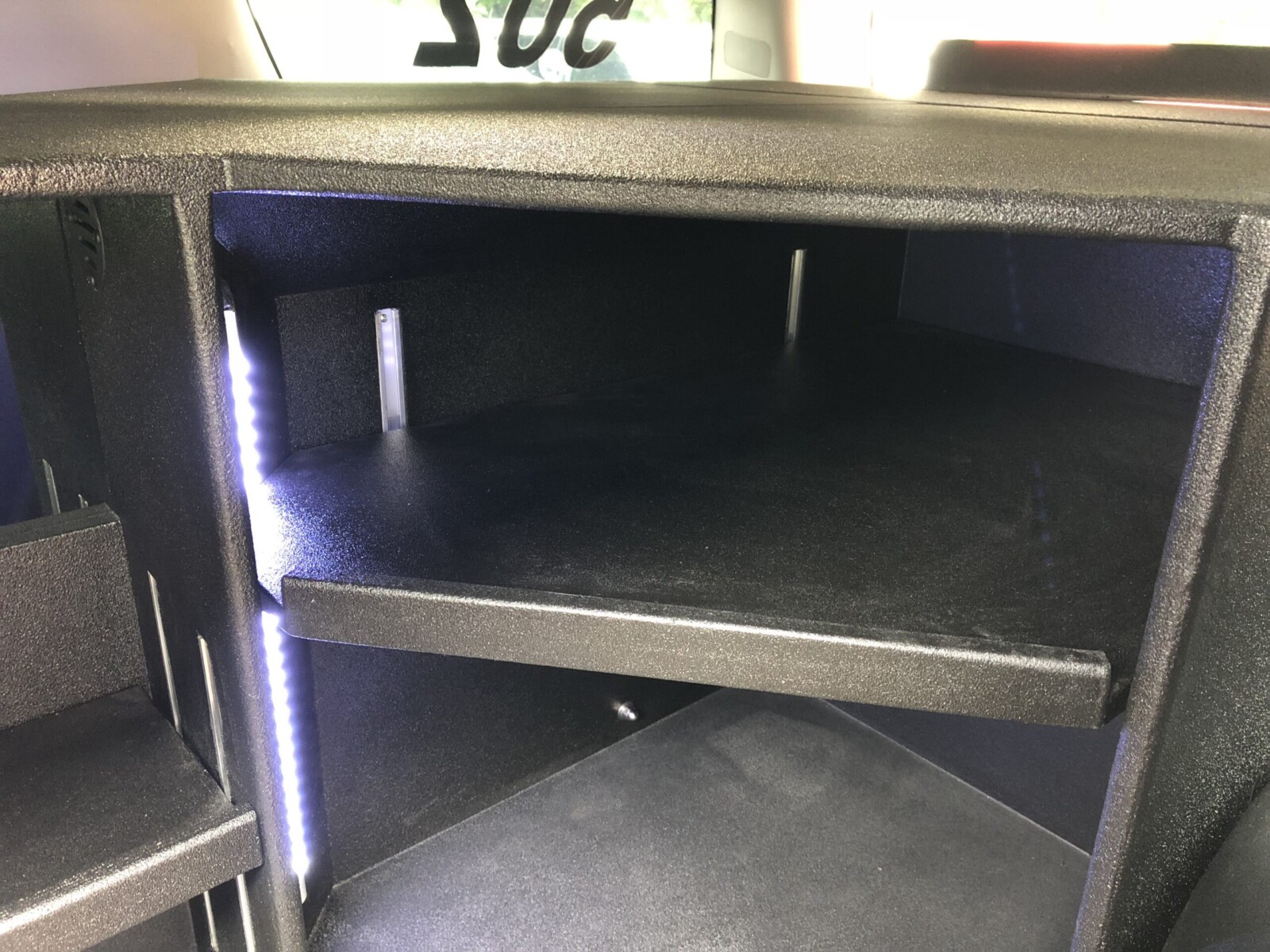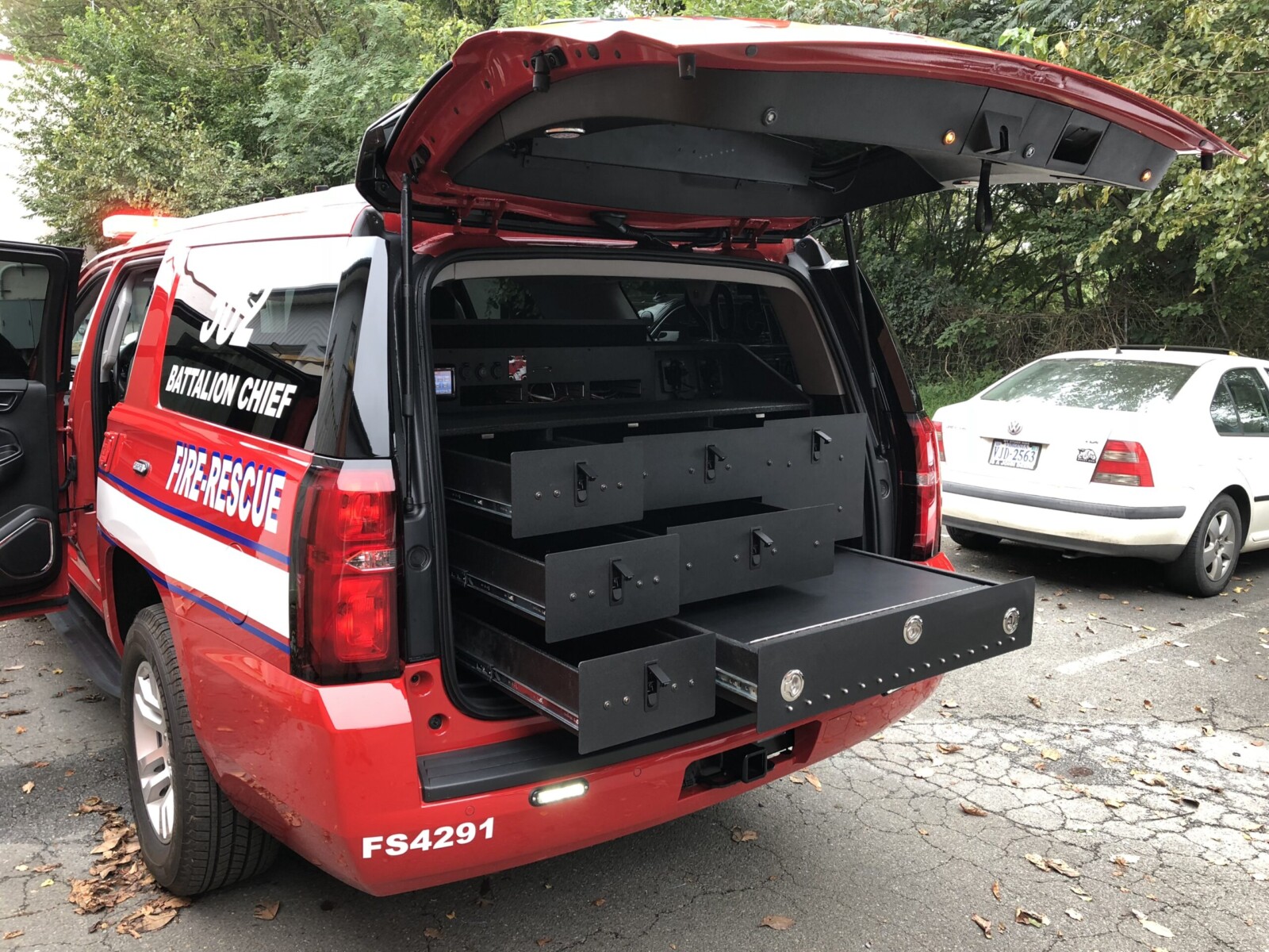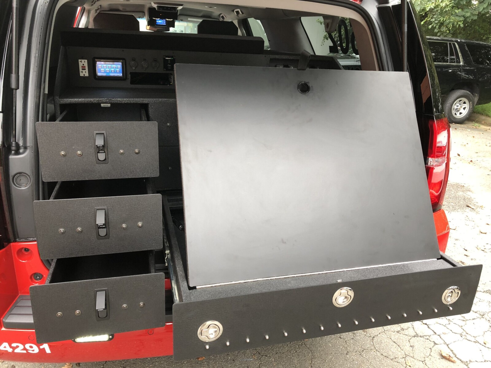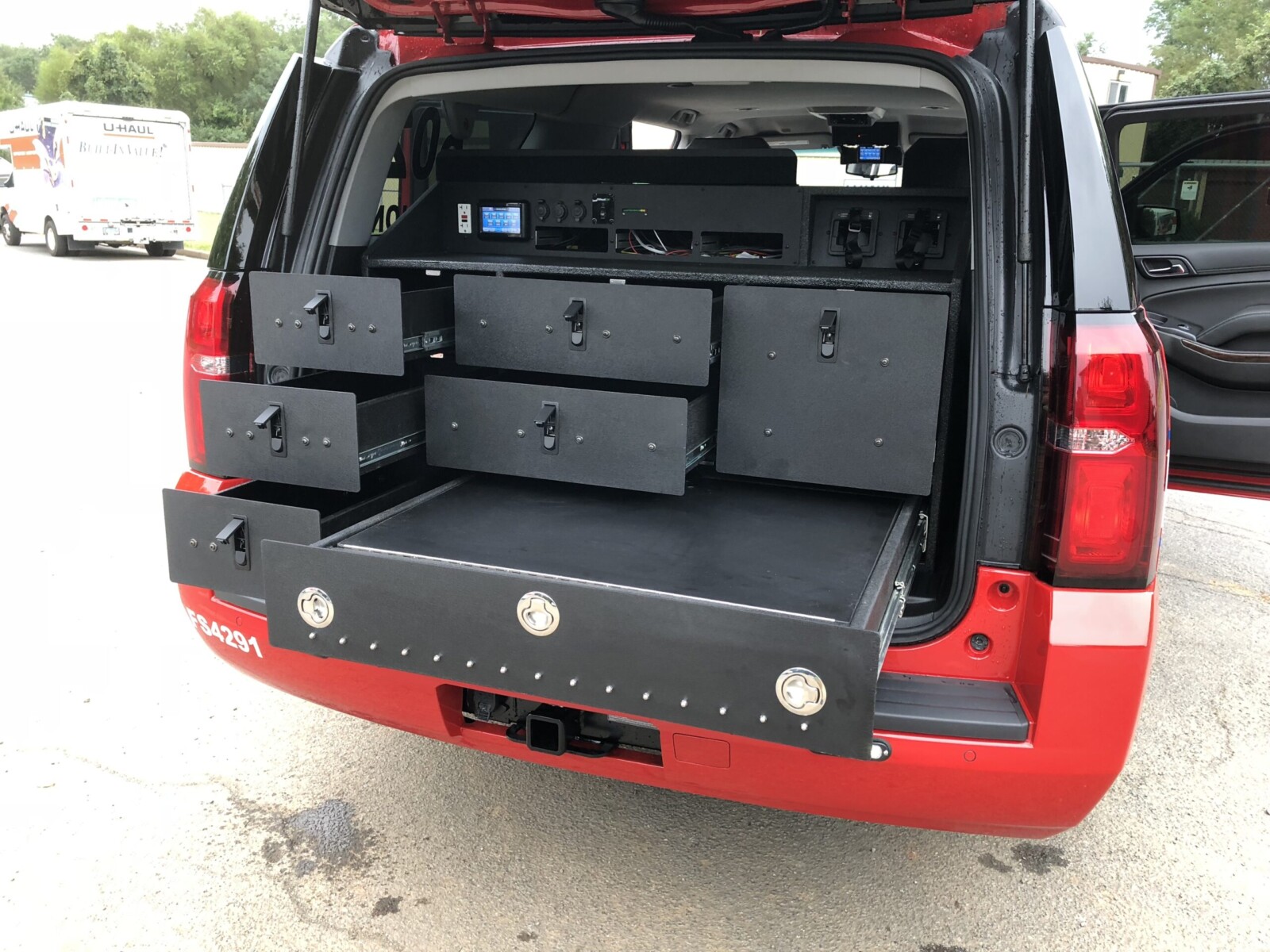 Liberty Light Bar, Whelen Lighting, FastPlex Technology for Lighing and Siren Control, Mobile Computing System, Radio System, Radio Docks, Liftgate Speaker, LED VU Meter Kit, Custom Console, Map Storage, Custom Overhead Console, Dual USB Port, Custom Rear Cabinetry, Command Drawer.